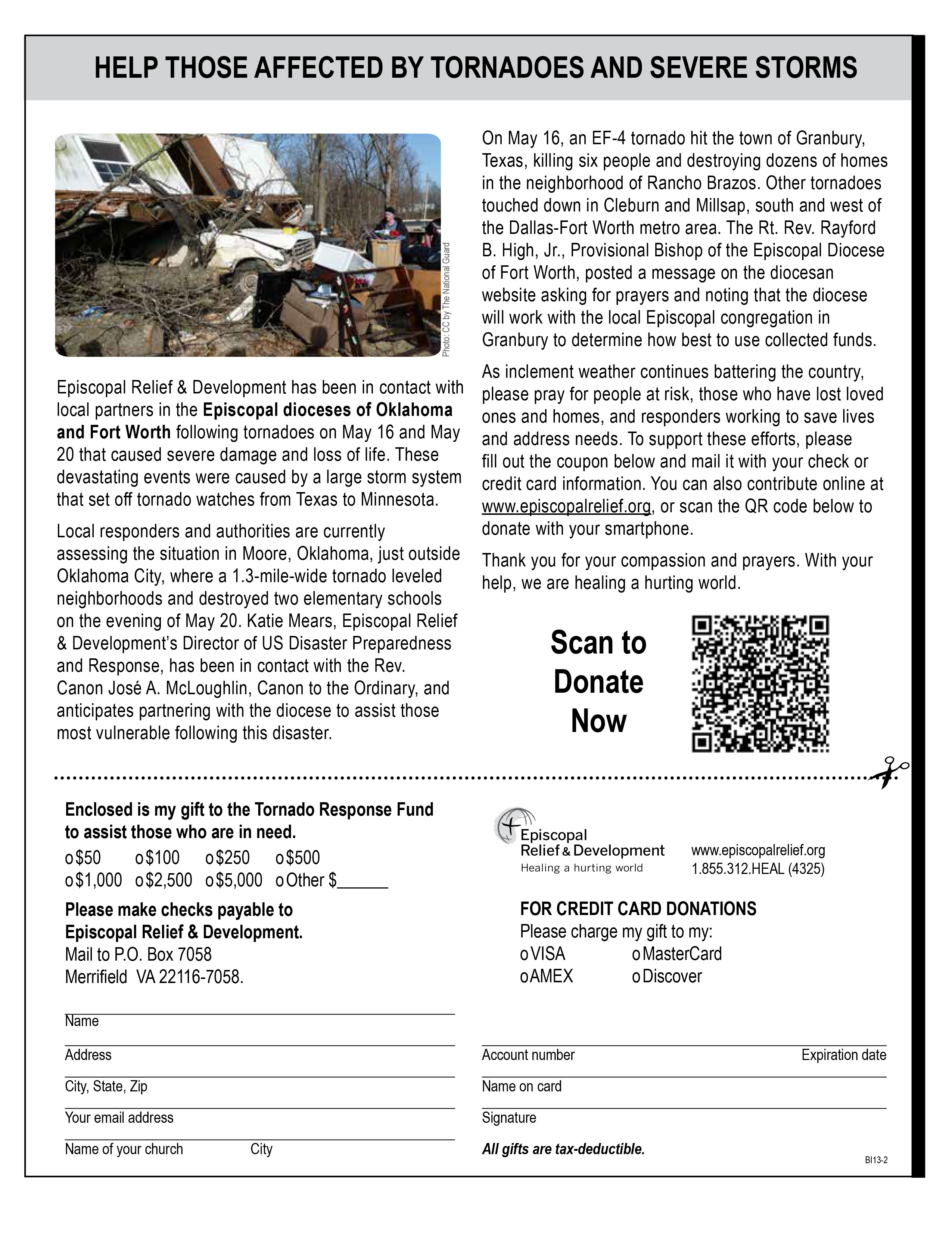 Contributions to the Tornado Response Fund will assist dioceses responding to recent disasters, and donations to the US Disaster Fund will help sustain vital year-round preparedness and response work. Gifts can be made online at www.episcopalrelief.org, by calling 1.855.312.HEAL (4325) or by mailing a check to Episcopal Relief & Development, PO Box 7058, Merrifield, VA 22116-7058.